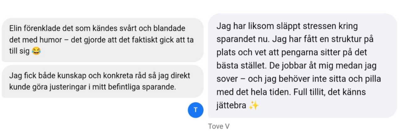 "Elin förenklade det som kändes svårt. Jag fick kunskap och råd så jag direkt kunde göra justeringar i mitt befintliga sparande"